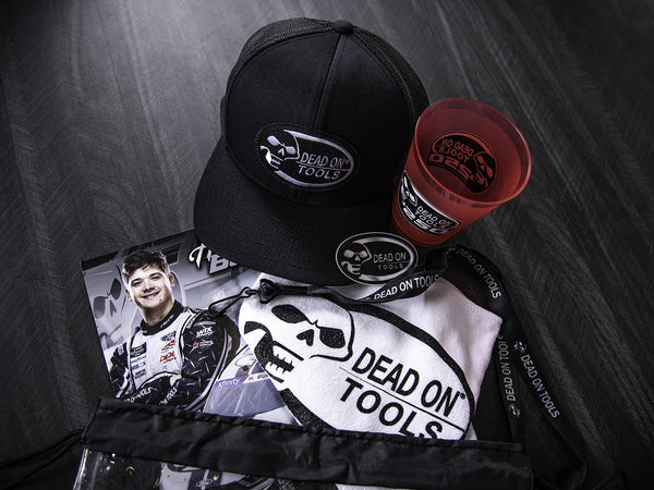 For a limited time, every $50 minimum purchase gets a free Race Day Fan Pack, only at DeadOnTools.com: hat, sticker, tailgating cup, lanyard, rally towel, and autographed Harrison Burton hero card, all packed in a stadium sling bag. Hurry, while supplies last!